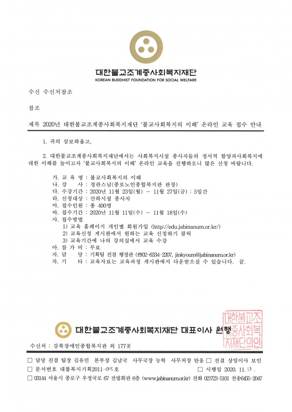 2. 대한불교조계종사회복지재단에서는 사회복지시설 종사자들의 정서적 함양과사회복지에 대한 이해를 높이고자 ‘불교사회복지의 이해’ 온라인 교육을 진행하오니 많은 신청 바랍니다.