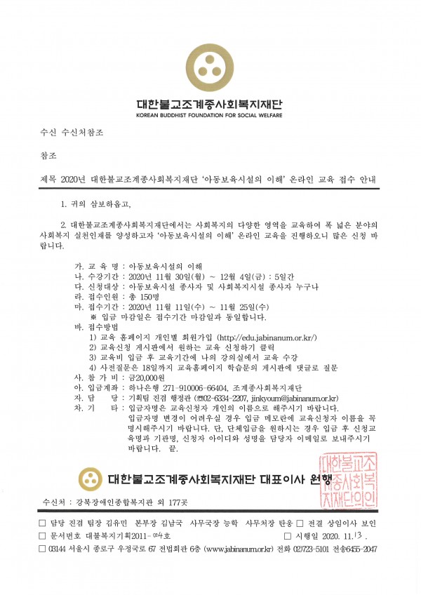 2. 대한불교조계종사회복지재단에서는 사회복지의 다양한 영역을 교육하여 폭 넓은 분야의 사회복지 실천인재를 양성하고자 ‘아동보육시설의 이해’ 온라인 교육을 진행하오니 많은 신청 바랍니다.
