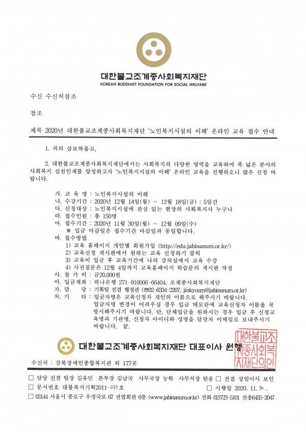 2. 대한불교조계종사회복지재단에서는 사회복지의 다양한 영역을 교육하여 폭 넓은 분야의 사회복지 실천인재를 양성하고자 ‘노인복지시설의 이해’ 온라인 교육을 진행하오니 많은 신청 바랍니다.